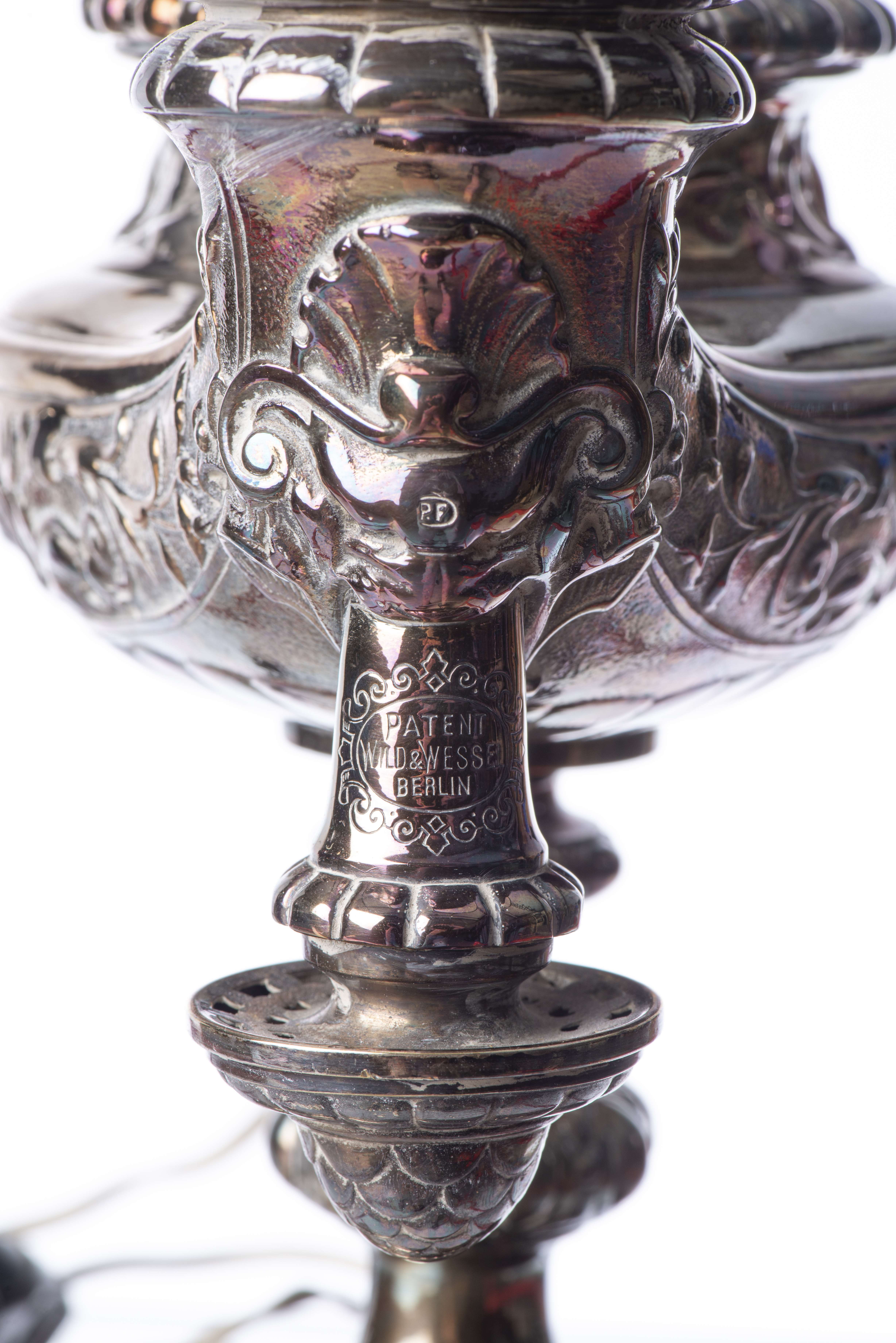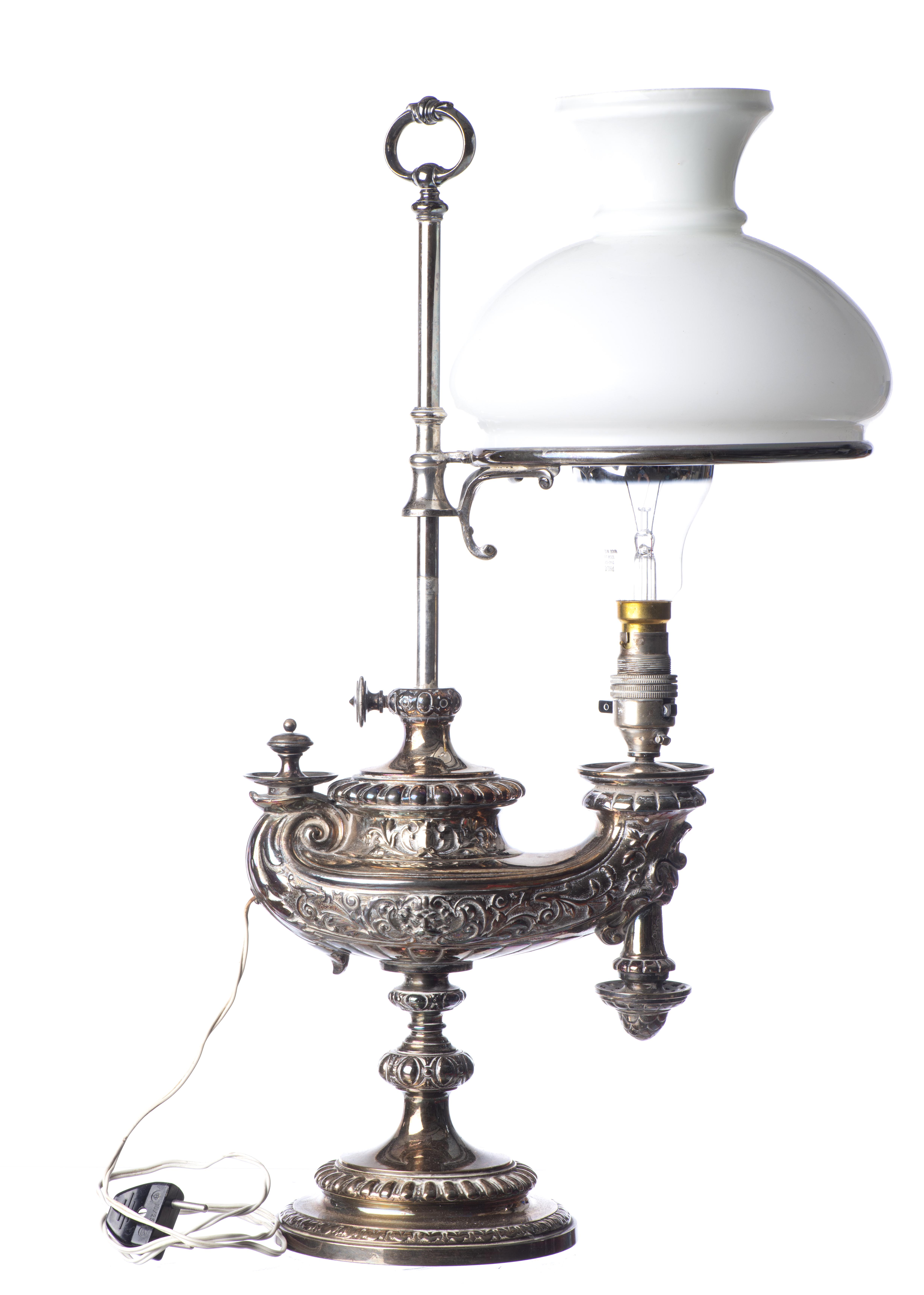 Lampe à huile en métal argenté par WW transformées pour l'électricité et abat-jour en opaline.