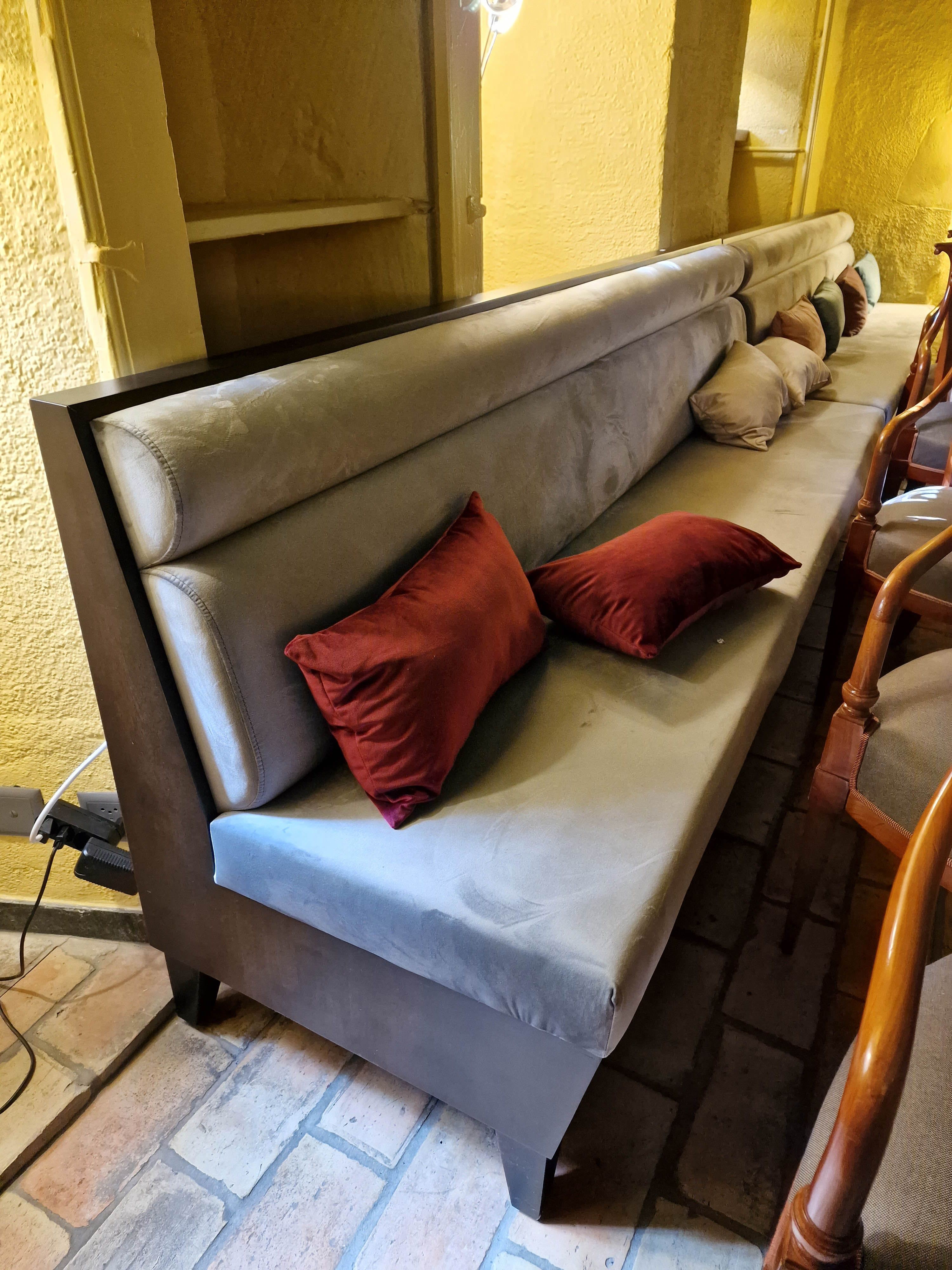 Grande banquette de style Art déco recouverte de tissu en alcantara gris clair