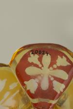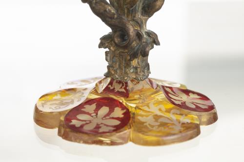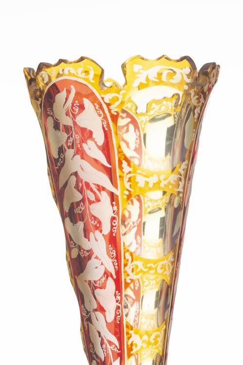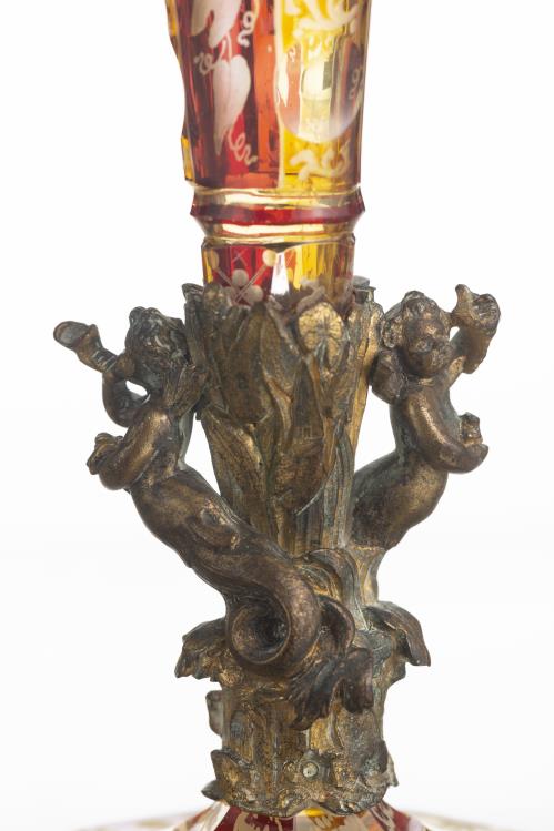 Vase cornet en cristal taillé de Bohême teinté rouge et jaune à décor gravé de liserons, monture en bronze doré à la base du vase à décor de deux putti sortant des feuillages, l'un soufflant dans un coquillage et l'autre écoutant le son du coquillage.